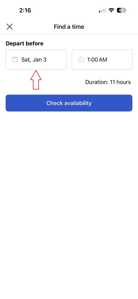 8. Your phone now shows the screen below. It will display “Today” and the current time. Touch “Today” and scroll until it displays the day, date AND time that you intend to return. The time is important. Do not pick 12:00 am as your return time as that will result in a faulty payment calculation. An example of the follow up screen is shown at 9 below.